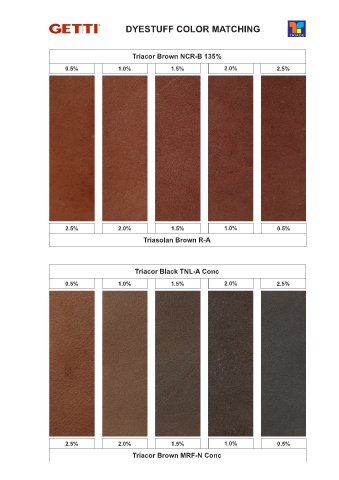 DYESTUFF COLOR MATCHING Triacor Brown NCR-B 135% 0.5% 1.0% 1.5% 2.0% 2.5% 2.5% 2.0% 1.5% 1.0% 0.5% Triasolan Brown R-A Triacor Black TNL-A Conc 0.5% 1.0% 1.5% 2.0% 2.5% 2.5% 2.0% 1.5% 1.0% 0.5% Triacor Brown MRF-N Conc