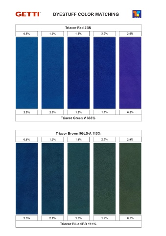 DYESTUFF COLOR MATCHING Triacor Red 2BN 0.5% 1.0% 1.5% 2.0% 2.5% 2.5% 2.0% 1.5% 1.0% 0.5% Triacor Green V 333% Triacor Brown 5GLS-A 115% 0.5% 1.0% 1.5% 2.0% 2.5% 2.5% 2.0% 1.5% 1.0% 0.5% Triacor Blue 6BR 115%