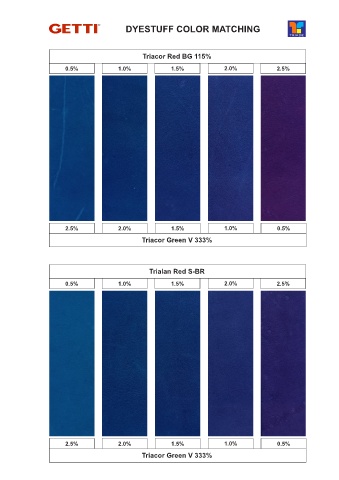 DYESTUFF COLOR MATCHING Triacor Red BG 115% 0.5% 1.0% 1.5% 2.0% 2.5% 2.5% 2.0% 1.5% 1.0% 0.5% Triacor Green V 333% Trialan Red S-BR 0.5% 1.0% 1.5% 2.0% 2.5% 2.5% 2.0% 1.5% 1.0% 0.5% Triacor Green V 333%