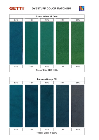 DYESTUFF COLOR MATCHING Triacor Yellow 2R Conc 0.5% 1.0% 1.5% 2.0% 2.5% 2.5% 2.0% 1.5% 1.0% 0.5% Triacor Blue 6BR 115% Triasolan Orange DR 0.5% 1.0% 1.5% 2.0% 2.5% 2.5% 2.0% 1.5% 1.0% 0.5% Triacor Green V 333%