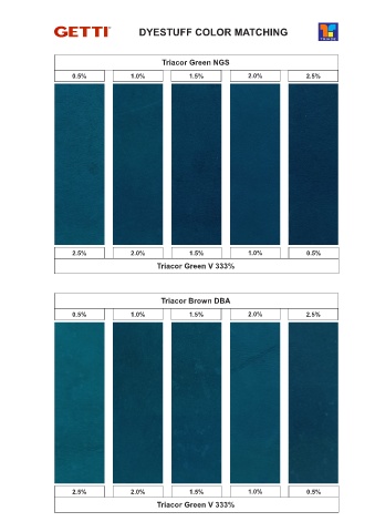 DYESTUFF COLOR MATCHING Triacor Green NGS 0.5% 1.0% 1.5% 2.0% 2.5% 2.5% 2.0% 1.5% 1.0% 0.5% Triacor Green V 333% Triacor Brown DBA 0.5% 1.0% 1.5% 2.0% 2.5% 2.5% 2.0% 1.5% 1.0% 0.5% Triacor Green V 333%