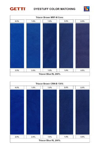 DYESTUFF COLOR MATCHING Triacor Brown MRF-N Conc 0.5% 1.0% 1.5% 2.0% 2.5% 2.5% 2.0% 1.5% 1.0% 0.5% Triacor Blue RL 200% Triacor Brown CRN-B 135% 0.5% 1.0% 1.5% 2.0% 2.5% 2.5% 2.0% 1.5% 1.0% 0.5% Triacor Blue RL 200%