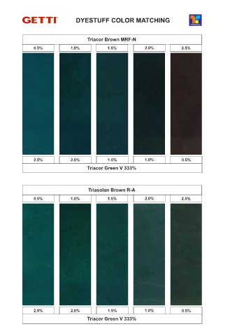 DYESTUFF COLOR MATCHING Triacor Brown MRF-N 0.5% 1.0% 1.5% 2.0% 2.5% 2.5% 2.0% 1.5% 1.0% 0.5% Triacor Green V 333% Triasolan Brown R-A 0.5% 1.0% 1.5% 2.0% 2.5% 2.5% 2.0% 1.5% 1.0% 0.5% Triacor Green V 333%