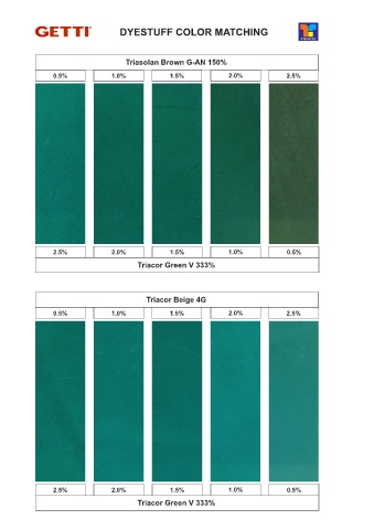 DYESTUFF COLOR MATCHING Triasolan Brown G-AN 150% 0.5% 1.0% 1.5% 2.0% 2.5% 2.5% 2.0% 1.5% 1.0% 0.5% Triacor Green V 333% Triacor Beige 4G 0.5% 1.0% 1.5% 2.0% 2.5% 2.5% 2.0% 1.5% 1.0% 0.5% Triacor Green V 333%