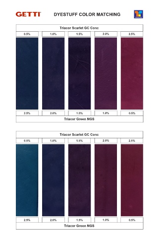 DYESTUFF COLOR MATCHING Triacor Scarlet GC Conc 0.5% 1.0% 1.5% 2.0% 2.5% 2.5% 2.0% 1.5% 1.0% 0.5% Triacor Green NGS Triacor Scarlet GC Conc 0.5% 1.0% 1.5% 2.0% 2.5% 2.5% 2.0% 1.5% 1.0% 0.5% Triacor Green NGS