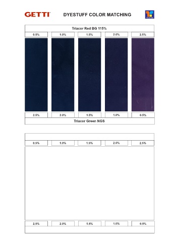 DYESTUFF COLOR MATCHING Triacor Red BG 115% 0.5% 1.0% 1.5% 2.0% 2.5% 2.5% 2.0% 1.5% 1.0% 0.5% Triacor Green NGS Triacor Red 2BN 0.5% 1.0% 1.5% 2.0% 2.5% 2.5% 2.0% 1.5% 1.0% 0.5% Triacor Green V 333%