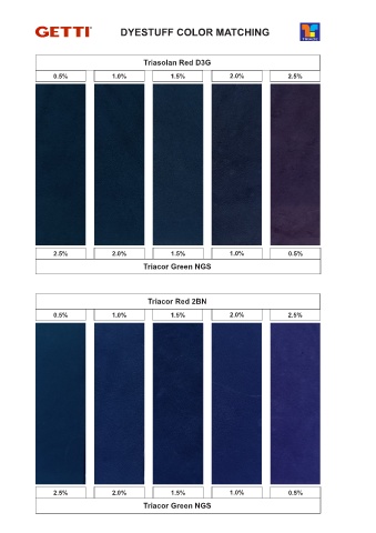 DYESTUFF COLOR MATCHING Triasolan Red D3G 0.5% 1.0% 1.5% 2.0% 2.5% 2.5% 2.0% 1.5% 1.0% 0.5% Triacor Green NGS Triacor Red 2BN 0.5% 1.0% 1.5% 2.0% 2.5% 2.5% 2.0% 1.5% 1.0% 0.5% Triacor Green NGS