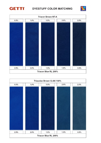 DYESTUFF COLOR MATCHING Triacor Brown NT-A 0.5% 1.0% 1.5% 2.0% 2.5% 2.5% 2.0% 1.5% 1.0% 0.5% Triacor Blue RL 200% Triasolan Brown G-AN 150% 0.5% 1.0% 1.5% 2.0% 2.5% 2.5% 2.0% 1.5% 1.0% 0.5% Triacor Blue RL 200%