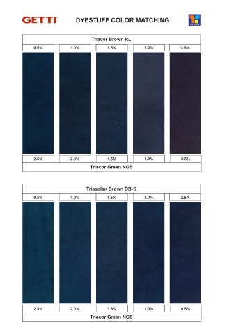 DYESTUFF COLOR MATCHING Triacor Brown RL 0.5% 1.0% 1.5% 2.0% 2.5% 2.5% 2.0% 1.5% 1.0% 0.5% Triacor Green NGS Triasolan Brown DB-C 0.5% 1.0% 1.5% 2.0% 2.5% 2.5% 2.0% 1.5% 1.0% 0.5% Triacor Green NGS
