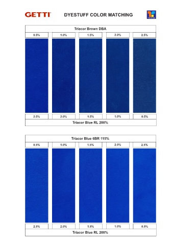 DYESTUFF COLOR MATCHING Triacor Brown DBA 0.5% 1.0% 1.5% 2.0% 2.5% 2.5% 2.0% 1.5% 1.0% 0.5% Triacor Blue RL 200% Triacor Blue 6BR 115% 0.5% 1.0% 1.5% 2.0% 2.5% 2.5% 2.0% 1.5% 1.0% 0.5% Triacor Blue RL 200%