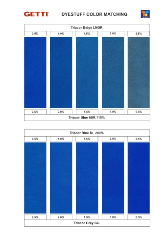 DYESTUFF COLOR MATCHING Triacor Beige LNGR 0.5% 1.0% 1.5% 2.0% 2.5% 2.5% 2.0% 1.5% 1.0% 0.5% Triacor Blue 6BR 115% Triacor Blue RL 200% 0.5% 1.0% 1.5% 2.0% 2.5% 2.5% 2.0% 1.5% 1.0% 0.5% Triacor Grey GC