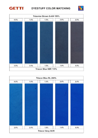 DYESTUFF COLOR MATCHING Triasolan Brown G-AN 150% 0.5% 1.0% 1.5% 2.0% 2.5% 2.5% 2.0% 1.5% 1.0% 0.5% Triacor Blue 6BR 115% Triacor Blue RL 200% 0.5% 1.0% 1.5% 2.0% 2.5% 2.5% 2.0% 1.5% 1.0% 0.5% Triacor Grey GCR