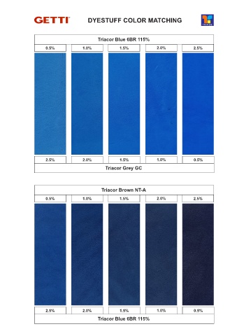 DYESTUFF COLOR MATCHING Triacor Blue 6BR 115% 0.5% 1.0% 1.5% 2.0% 2.5% 2.5% 2.0% 1.5% 1.0% 0.5% Triacor Grey GC Triacor Brown NT-A 0.5% 1.0% 1.5% 2.0% 2.5% 2.5% 2.0% 1.5% 1.0% 0.5% Triacor Blue 6BR 115%