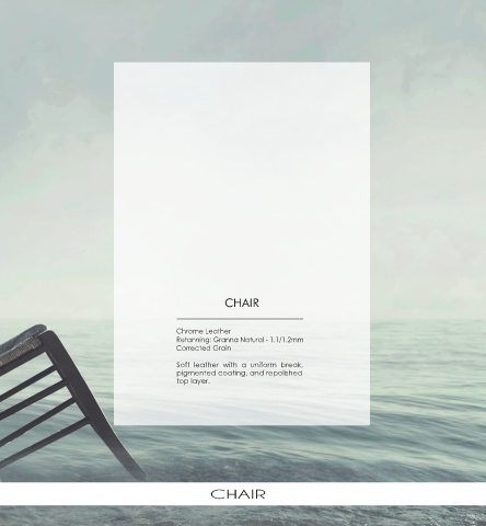 CHAIR Chrome Leather Retanning: Granna Natural - 1.1/1.2mm Corrected Grain Soft leather with a uniform break, pigmented coating, and repolished top layer. CHAIR CHAIR CHAIR