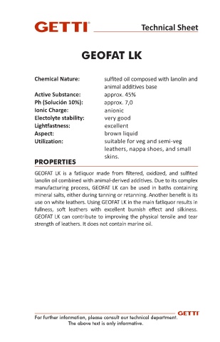 GEOFAT LK is a fatliquor made from filtered, oxidized, and sulfited