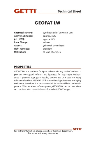 GEOFAT LW is a synthetic fatliquor to be use in any kind of leathers. It