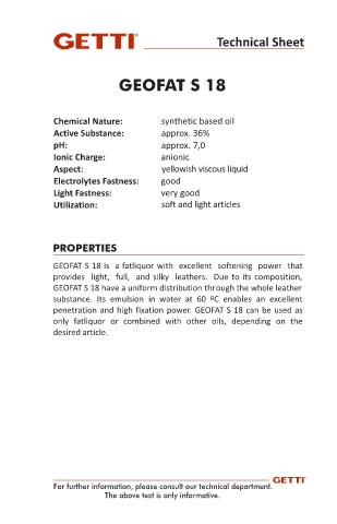 GEOFAT S 18 is a fatliquor with excellent softening power that