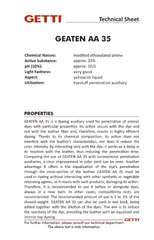 GEATEN AA 35 is a dyeing auxiliary used for penetra on of anionic