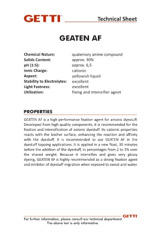 GEATEN AF is a high performance fixation agent for anionic dyestuff.