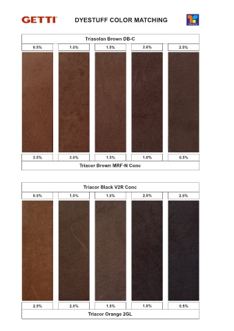 DYESTUFF COLOR MATCHING Triasolan Brown DB-C 0.5% 1.0% 1.5% 2.0% 2.5% 2.5% 2.0% 1.5% 1.0% 0.5% Triacor Brown MRF-N Conc Triacor Black V2R Conc 0.5% 1.0% 1.5% 2.0% 2.5% 2.5% 2.0% 1.5% 1.0% 0.5% Triacor Orange 2GL