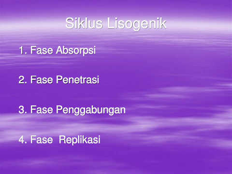 Siklus Lisogenik 1. Fase Absorpsi 2. Fase Penetrasi 3. Fase Penggabungan 4. Fase Replikasi