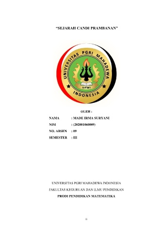 “SEJARAH CANDI PRAMBANAN” OLEH : NAMA : MADE IRMA SURYANI NIM : (202001060009) NO. ABSEN : 09 SEMESTER : III UNIVERSITAS PGRI MAHADEWA INDONESIA FAKULTAS KEGURUAN DAN ILMU PENDIDIKAN PRODI PENDIDIKAN MATEMATIKA ii