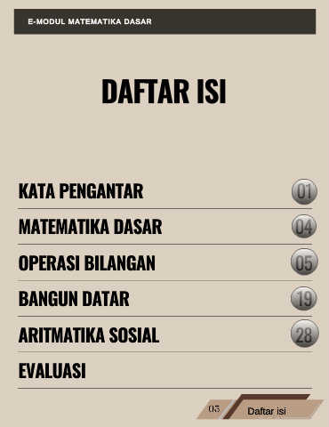 E-MODUL MATEMATIKA DASAR DAFTAR ISI KATA PENGANTAR 01 MATEMATIKA DASAR 04 OPERASI BILANGAN 05 BANGUN DATAR 19 ARITMATIKA SOSIAL 28 EVALUASI 03 Daftar isi