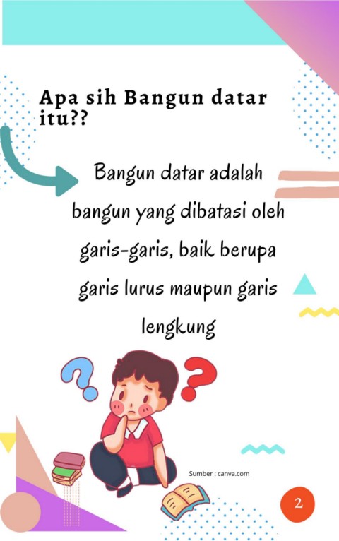 Apa sih Bangun datar itu?? Bangun datar adalah bangun yang dibatasi oleh garis-garis, baik berupa garis lurus maupun garis lengkung Sumber : canva.com 2 2 9