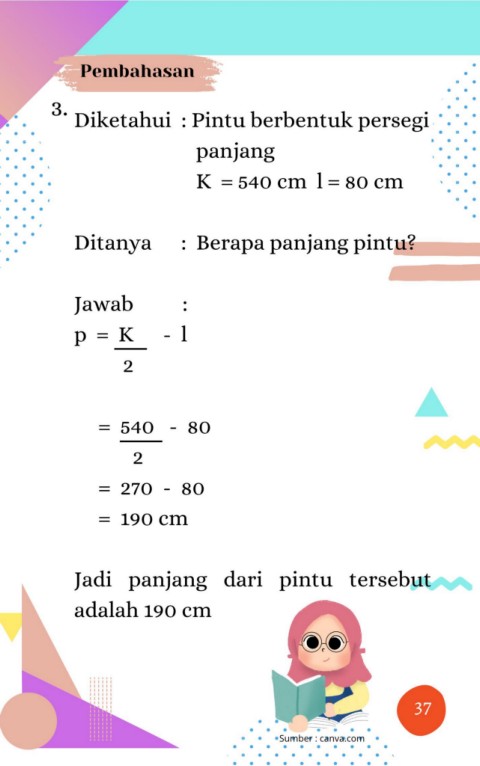 Pembahasan 3. Diketahui : Pintu berbentuk persegi panjang K = 540 cm l = 80 cm Ditanya : Berapa panjang pintu? Jawab : p = K - l 2 = 540 - 80 2 = 270 - 80 = 190 cm Jadi panjang dari pintu tersebut adalah 190 cm 17 37 Sumber : canva.com