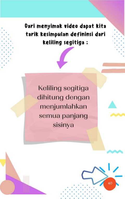 Dari menyimak video dapat kita tarik kesimpulan defininsi dari keliling segitiga : Keliling segitiga dihitung dengan menjumlahkan semua panjang sisinya 17 40