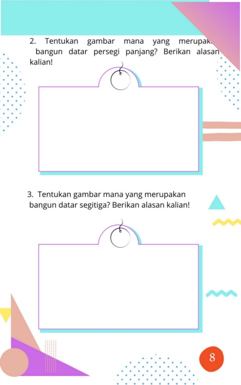 2. Tentukan gambar mana yang merupakan bangun datar persegi panjang? Berikan alasan kalian! 3. Tentukan gambar mana yang merupakan bangun datar segitiga? Berikan alasan kalian! 17 8