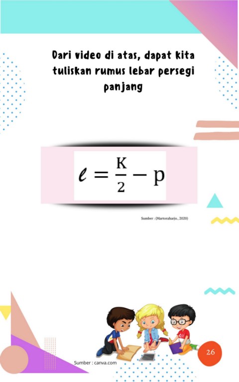Dari video di atas, dapat kita tuliskan rumus lebar persegi panjang Sumber : (Martoraharjo., 2020) 17 26 Sumber : canva.com