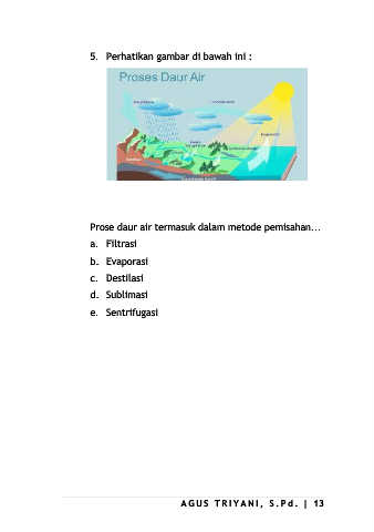 5. Perhatikan gambar di bawah ini : Prose daur air termasuk dalam metode pemisahan... a. Filtrasi b. Evaporasi c. Destilasi d. Sublimasi e. Sentrifugasi A G U S T R I Y A N I , S . P d . | 13