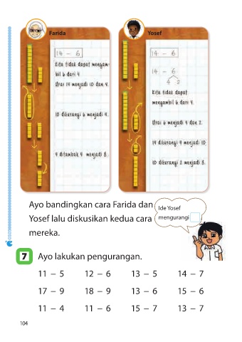 Farida Yosef Ayo bandingkan cara Farida dan Ide Yosef Yosef lalu diskusikan kedua cara mengurangi . Aktifitas mereka. Ayo lakukan pengurangan. 7 7 11 − 5 12 − 6 13 − 5 14 − 7 17 − 9 18 − 9 13 − 6 15 − 6 11 − 4 11 − 6 15 − 7 13 − 7 104