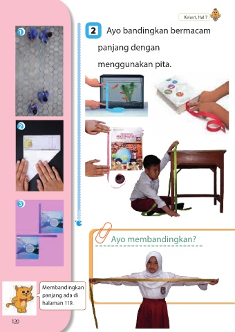 Kelas1, Hal 7 2 2 ➊ Ayo bandingkan bermacam panjang dengan menggunakan pita. ➋ ➌ Aktifitas Ayo membandingkan? Membandingkan panjang ada di halaman 119. 120