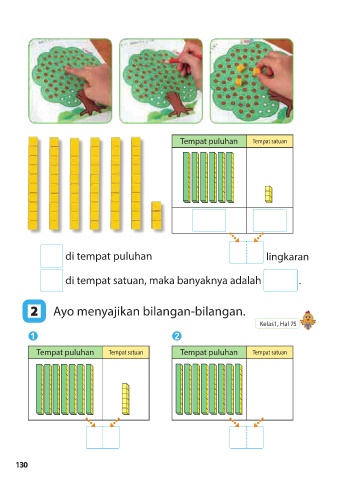 Tempat puluhan Tempat satuan di tempat puluhan lingkaran di tempat satuan, maka banyaknya adalah . 2 2 Ayo menyajikan bilangan-bilangan. Kelas1, Hal 75 ➊ ➋ Tempat puluhan Tempat satuan Tempat puluhan Tempat satuan 130
