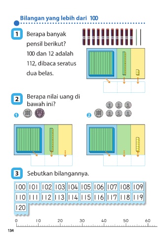 Bilangan yang lebih dari 100 100 1 Berapa banyak pensil berikut? 100 dan 12 adalah 112, dibaca seratus dua belas. 2 Berapa nilai uang di bawah ini? ➊ ➋ 3 Sebutkan bilangannya. 134