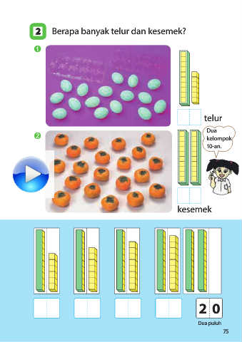 2 2 Berapa banyak telur dan kesemek? ➊ telur ➋ Dua kelompok 10-an. kesemek 2 0 Dua puluh 75