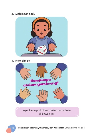 3. Melempar dadu 4. Hom pim pa Hompimpa alaium gambreng! Ayo, kamu praktikkan dalam permainan di bawah ini! 118 Pendidikan Jasmani, Olahraga, dan Kesehatan untuk SD/MI Kelas I
