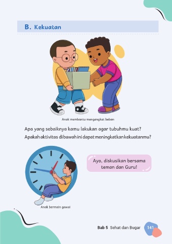 B. Kekuatan Anak membantu mengangkat beban Apa yang sebaiknya kamu lakukan agar tubuhmu kuat? Apakah aktivitas di bawah ini dapat meningkatkan kekuatanmu? Ayo, diskusikan bersama teman dan Guru! Anak bermain gawai Bab 5 Sehat dan Bugar 141