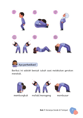 7 7 8 8 9 9 1o 1o 11 11 12 12 Ayo perhatikan! Berikut ini adalah bentuk tubuh saat melakukan gerakan menekuk. membungkuk meliuk/meregang membusur Bab 1 Serunya Gerak di Tempat 7