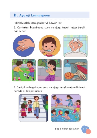 D. Ayo uji kemampuan Pilihlah salah satu gambar di bawah ini! 1. Ceritakan bagaimana cara menjaga tubuh tetap bersih dan sehat! 2. Ceritakan bagaimana cara menjaga keselamatan diri saat berada di tempat umum! Bab 6 Sehat dan Aman 177