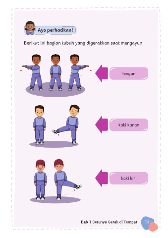 Ayo perhatikan! Berikut ini bagian tubuh yang digerakkan saat mengayun. lengan kaki kanan kaki kiri Bab 1 Serunya Gerak di Tempat 13
