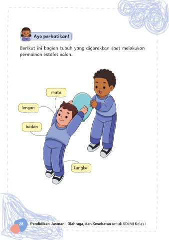 Ayo perhatikan! Berikut ini bagian tubuh yang digerakkan saat melakukan permainan estafet balon. mata lengan badan tungkai 28 Pendidikan Jasmani, Olahraga, dan Kesehatan untuk SD/MI Kelas I