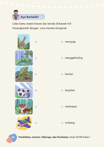 Ayo Berlatih! Coba kamu amati hewan dan benda di bawah ini! Pasangkanlah dengan cara mereka bergerak. merayap menggelinding berlari berjalan melompat terbang 36 Pendidikan Jasmani, Olahraga, dan Kesehatan untuk SD/MI Kelas I