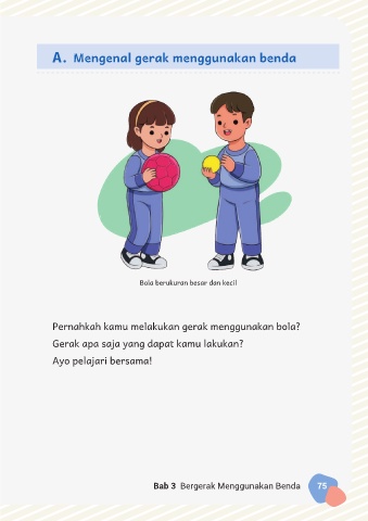 A. Mengenal gerak menggunakan benda Bola berukuran besar dan kecil Pernahkah kamu melakukan gerak menggunakan bola? Gerak apa saja yang dapat kamu lakukan? Ayo pelajari bersama! Bab 3 Bergerak Menggunakan Benda 75