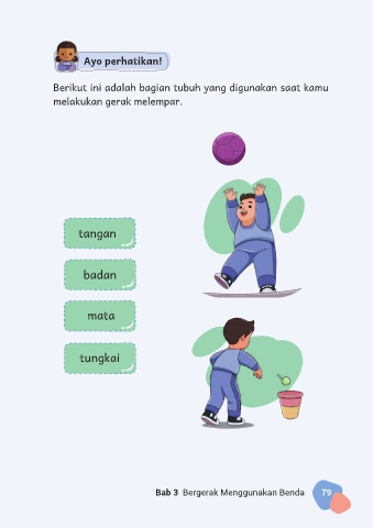 Ayo perhatikan! Berikut ini adalah bagian tubuh yang digunakan saat kamu melakukan gerak melempar. tangan badan mata tungkai Bab 3 Bergerak Menggunakan Benda 79