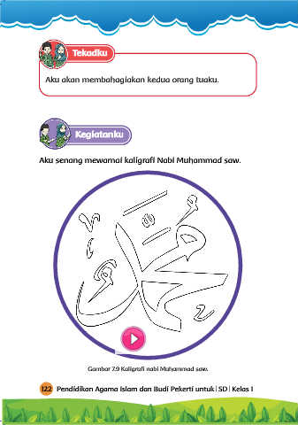 Tekadku Aku akan membahagiakan kedua orang tuaku. Kegiatanku Aku senang mewarnai kaligrafi Nabi Muhammad saw. Gambar 7.9 Kaligrafi nabi Muhammad saw. 122 Pendidikan Agama Islam dan Budi Pekerti untuk SD Kelas I