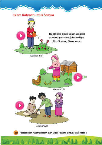 Islam Rahmat untuk Semua Bukti kita cinta Allah adalah sayang semua ciptaan-Nya. Aku Sayang Semuanya Gambar 2.10 Gambar 2.11 Gambar 2.12 30 Pendidikan Agama Islam dan Budi Pekerti untuk SD Kelas I