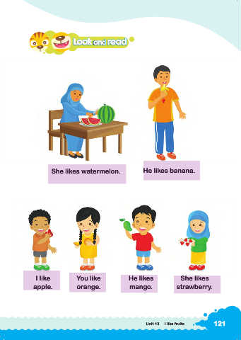 Look and read L Look and read read ook L ook and r ead and She likes watermelon. He likes banana. I like You like He likes She likes apple. orange. mango. strawberry. Unit 13 I like fruits 121